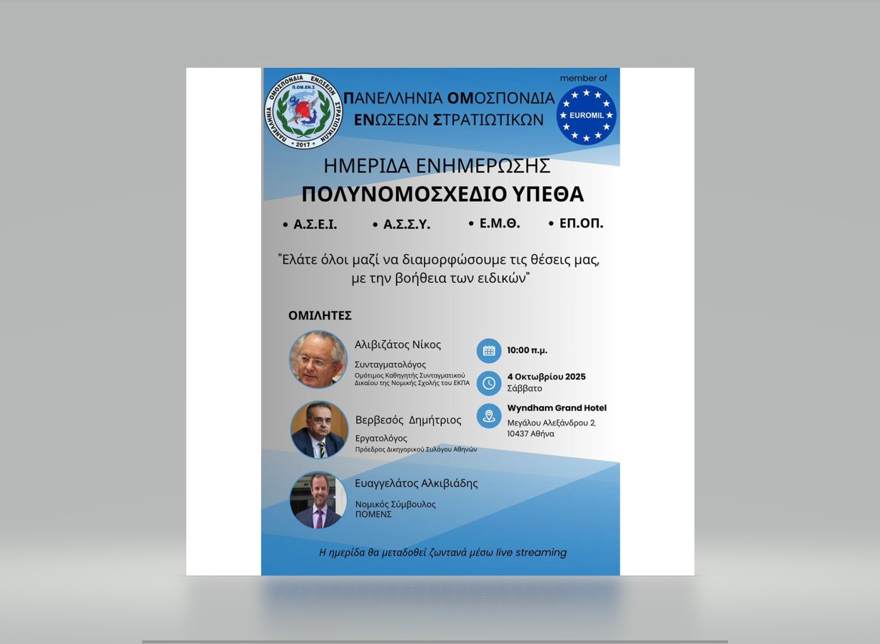 Το Σάββατο 4 Οκτωβρίου 2025 η Π.ΟΜ.ΕΝ.Σ. διοργάνωσε Ημερίδα Ενημέρωσης σχετικά με το επικείμενο Πολυνομοσχέδιο του Υπουργείου Εθνικής Άμυνας. Στην ενημέρωση κατέθεσαν τη νομική τους άποψη ο κ. Νικόλαος Αλιβιζάτος, ομότιμος Καθηγητής Συνταγματικού Δικαίου του ΕΚΠΑ, ο κ. Δημήτριος Βερβεσός, Πρόεδρος του Δικηγορικού Συλλόγου Αθηνών, καθώς και ο κ. Αλκιβιάδης Ευαγγελάτος, νομικός σύμβουλος της Π.ΟΜ.ΕΝ.Σ.