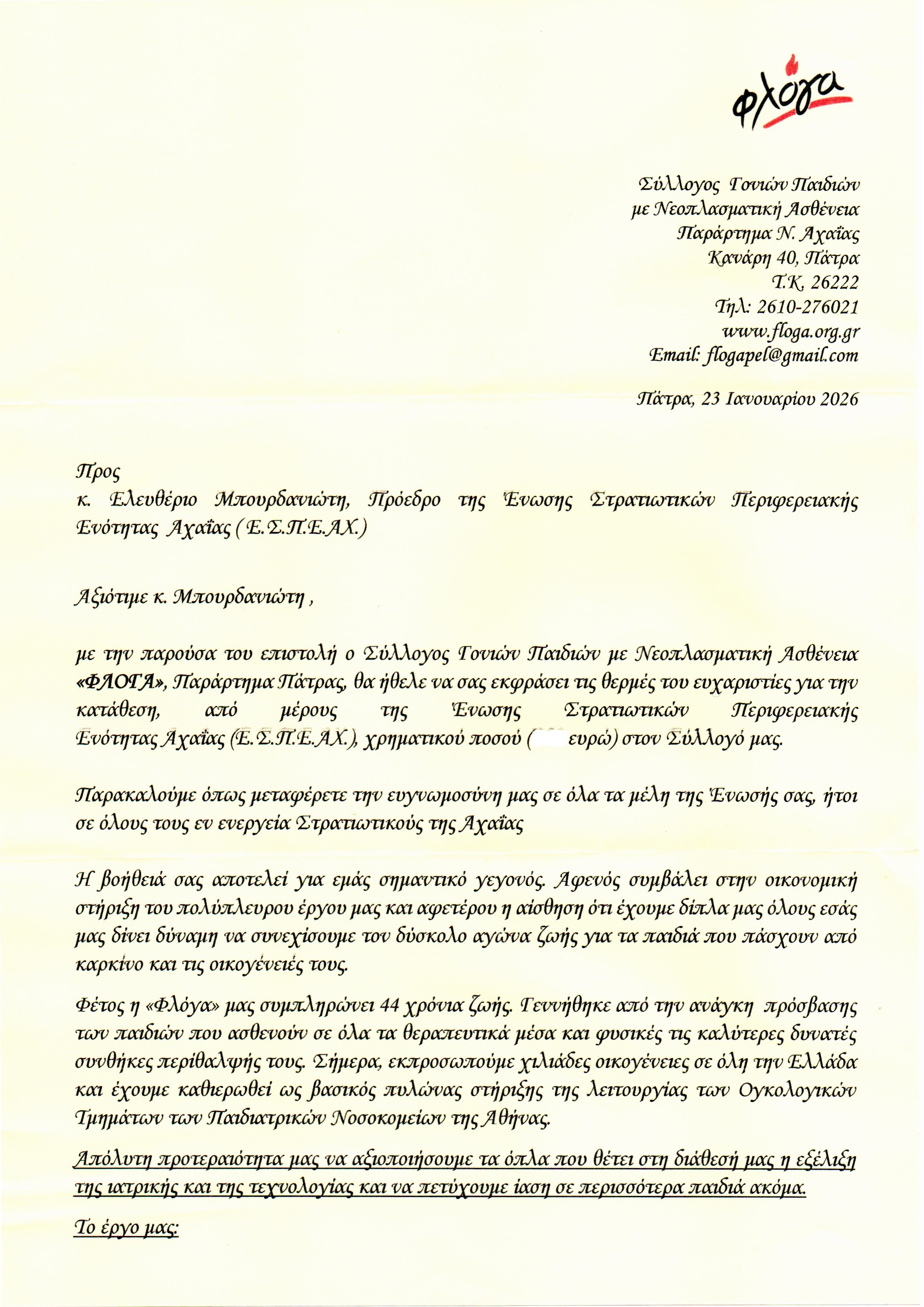 Με αφορμή τον αγώνα FLOGA RACE που διοργάνωσε ο Σύλλογος Γονιών Παιδιών με Νεολασματική Ασθένεια «ΦΛΟΓΑ» στις 31 Ιανουαρίου 2026, το Διοικητικό Συμβούλιο της ΕΣΠΕΑΧ αποφάσισε, πέρα από την ενημέρωση των μελών της για τη δυνατότητά τους να συμμετέχουν στον αγώνα, τη χρηματική δωρεά προς τη «ΦΛΟΓΑ».